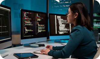 Desarrollo en lenguajes clave como Python, C#, Kotlin, .NET y Java, aplicados a entornos web, mobile y empresariales, con el soporte de IA como copiloto de desarrollo para acelerar la escritura, el testing y la depuración de código.